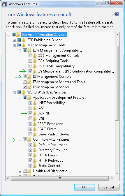 1 Install windows features in “turn windows features on or off”. You need these things (which are not installed by default):